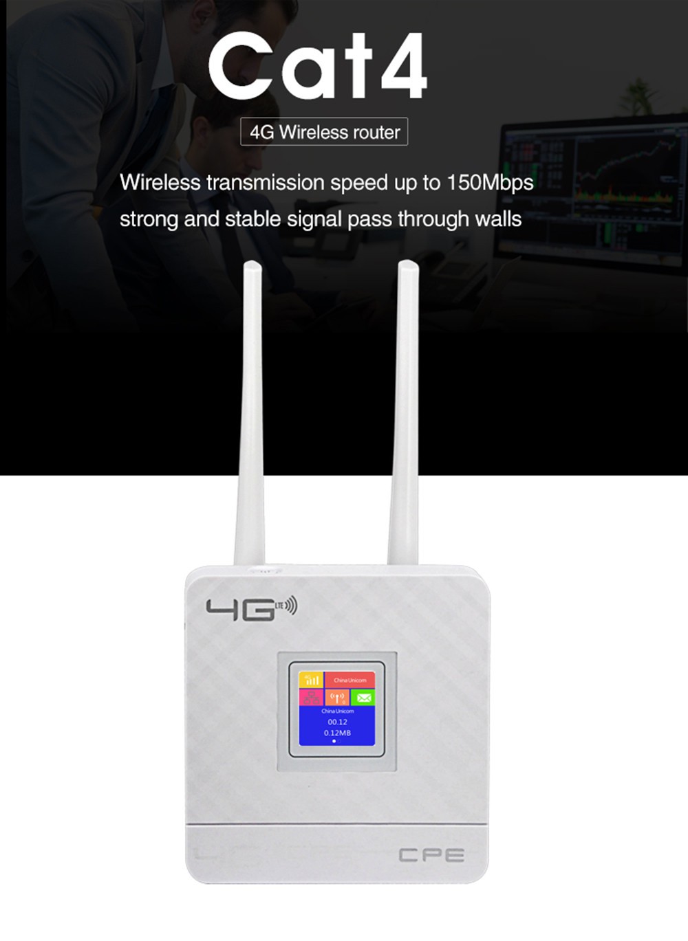 CPE903 هو جهاز توجيه لاسلكي 4G عالية الطاقة مع فتحة بطاقة سيم 4G ومعالج الشبكات MIPS، بل هو حل للمؤسسة والمنزل والشركة، وشبكة واي فاي المكتب. وهو متوافق مع معيار IEEE 802.11b/g/n، ويصل معدل البيانات إلى 300 ميجابت في الثانية. مع هوائي خارجي مزدوج، إشارة واي فاي هو أكثر استقرارا وأطول مدى. وهو يدعم 10 مستخدمي واي فاي في وقت واحد.